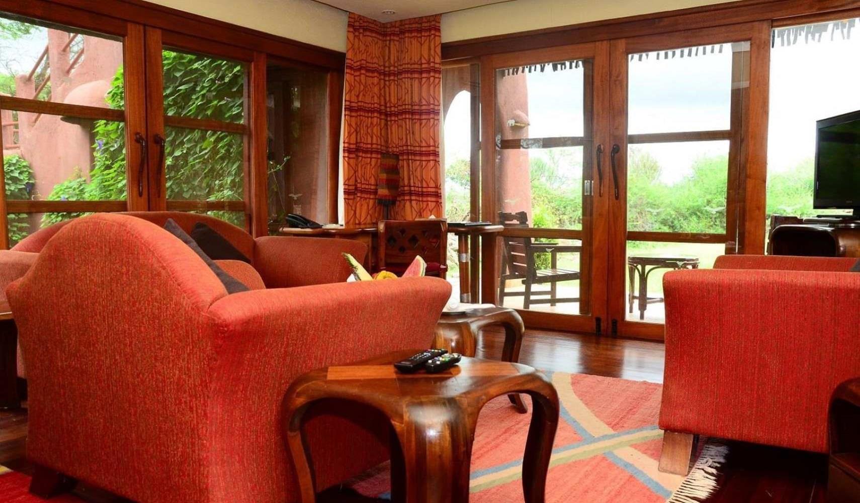 De mooie, sfeervolle kamers hebben elk een eigen Maasai Manyatta-thema met handgeschilderde wilde dieren op de muren, een eigen badkamer en een balkon met uitzicht over Amboseli.