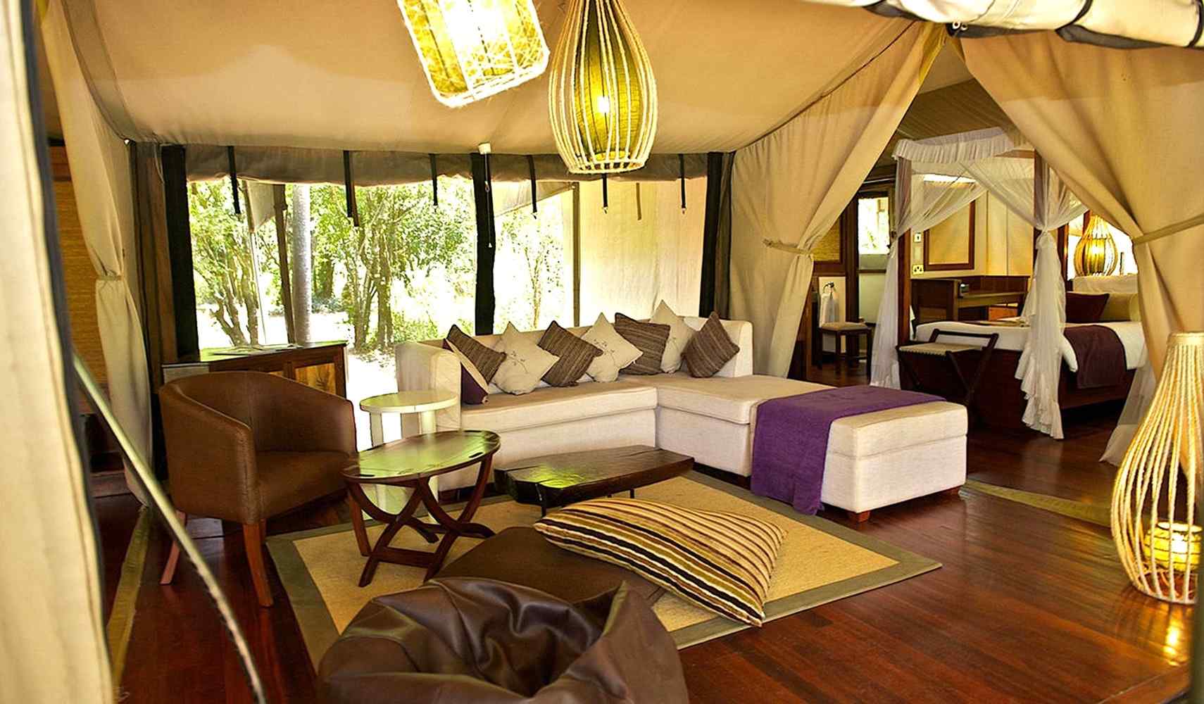 De elegant ingerichte tenten staan op verhoogde platforms en zijn allen voorzien van een houten hemelbed met klamboe, een moderne, eigen badkamer met een dubbele wastafel, douche en toilet en een heerlijk eigen terras/balkon.