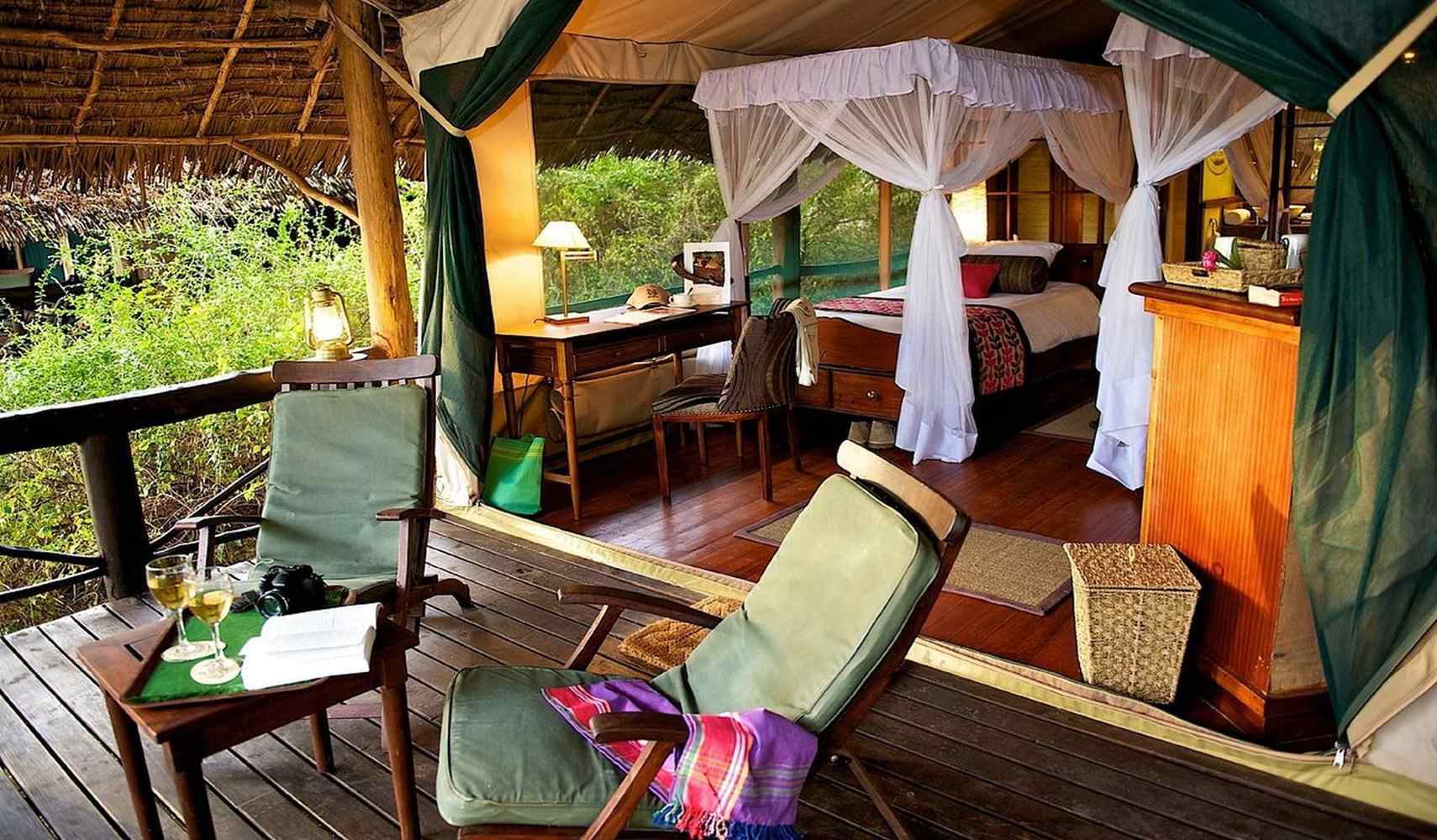 De ruime safari-tenten van dit sfeervolle camp staan op stevige verhoogde platforms en zijn voorzien van een hemelbed met klamboe, mahoniehouten meubelen en houten vloeren. De moderne, eigen badkamer heeft een dubbele wastafel en toilet.