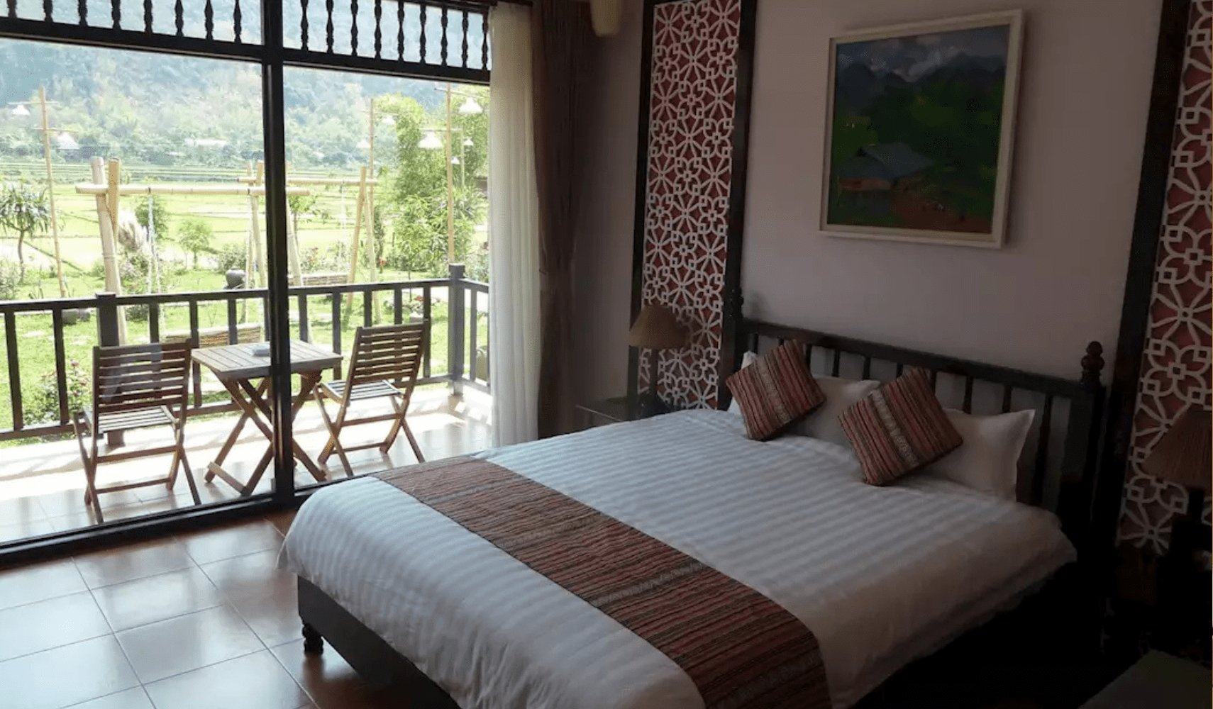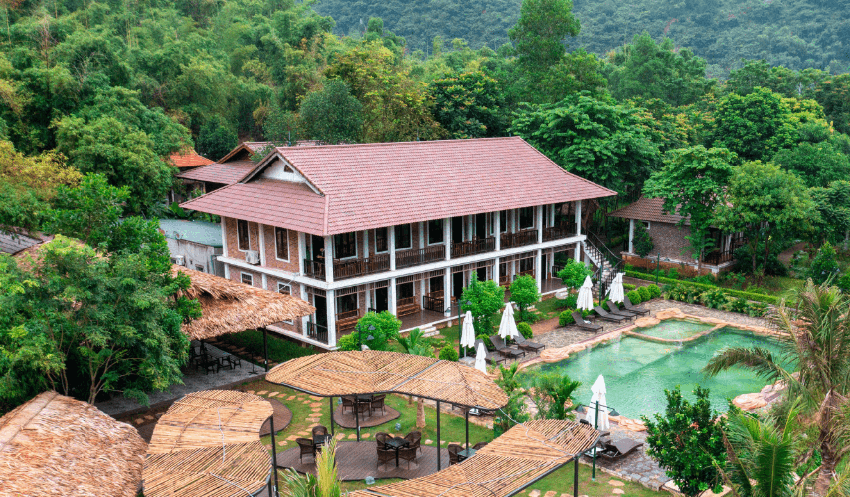 Sol Bungalows Resort in Mai Chau is een heerlijk rustige accommodatie in de bergen tussen de groene rijstvelden. Het kleinschalige resort heeft een bar/lounge, een heel goed restaurant en een tuin met zwembad. Hier slaap je in gezellige huisjes die mooi zijn ingericht met donkere houten meubels, een eigen terras en verder een kluisje, wifi, minibar, koffiezetapparaat, tv en fijne badkamer. Je kunt wandelen, fietsen en de vriendelijke mensen uit het dorp ontmoeten. Een fijne plek voor het hele gezin!