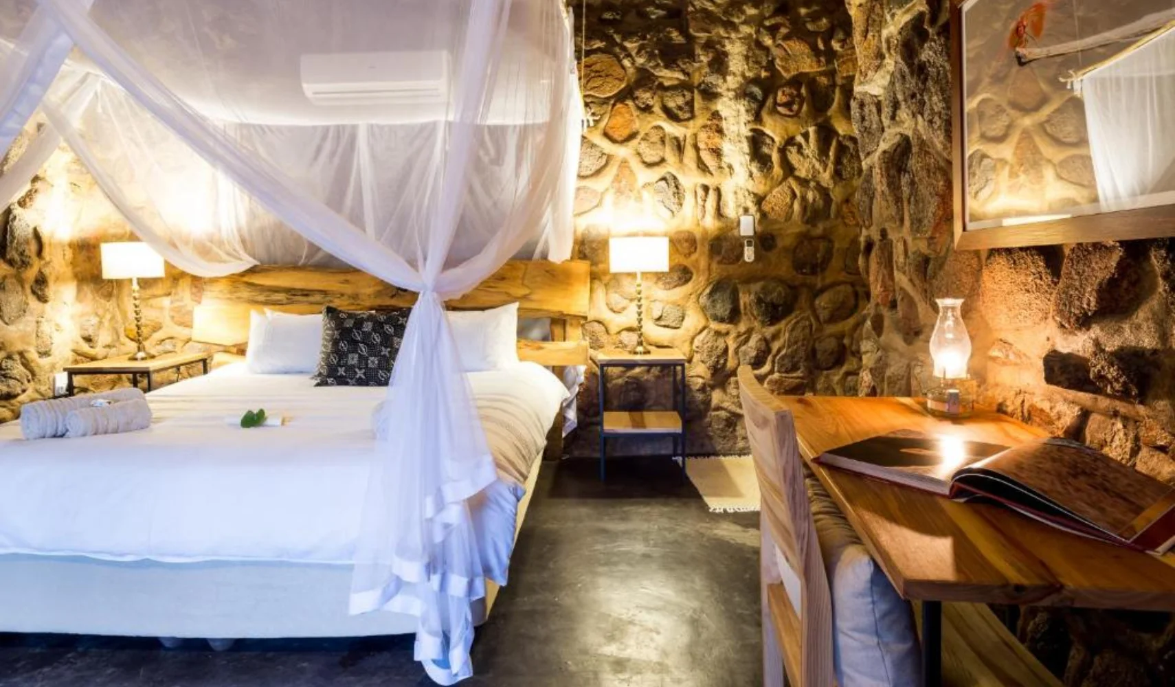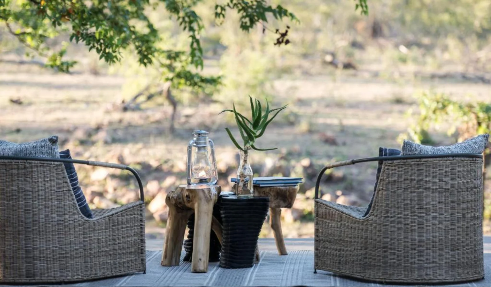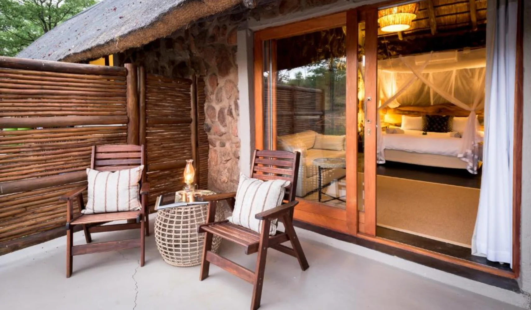 De 3 chalets in Chacma Bush Camp zijn gebouwd van stenen keien, en voorzien van airco, waterkoker, kluis, goede bedden, een terras met heerlijke stoelen en een eigen badkamer met douche.