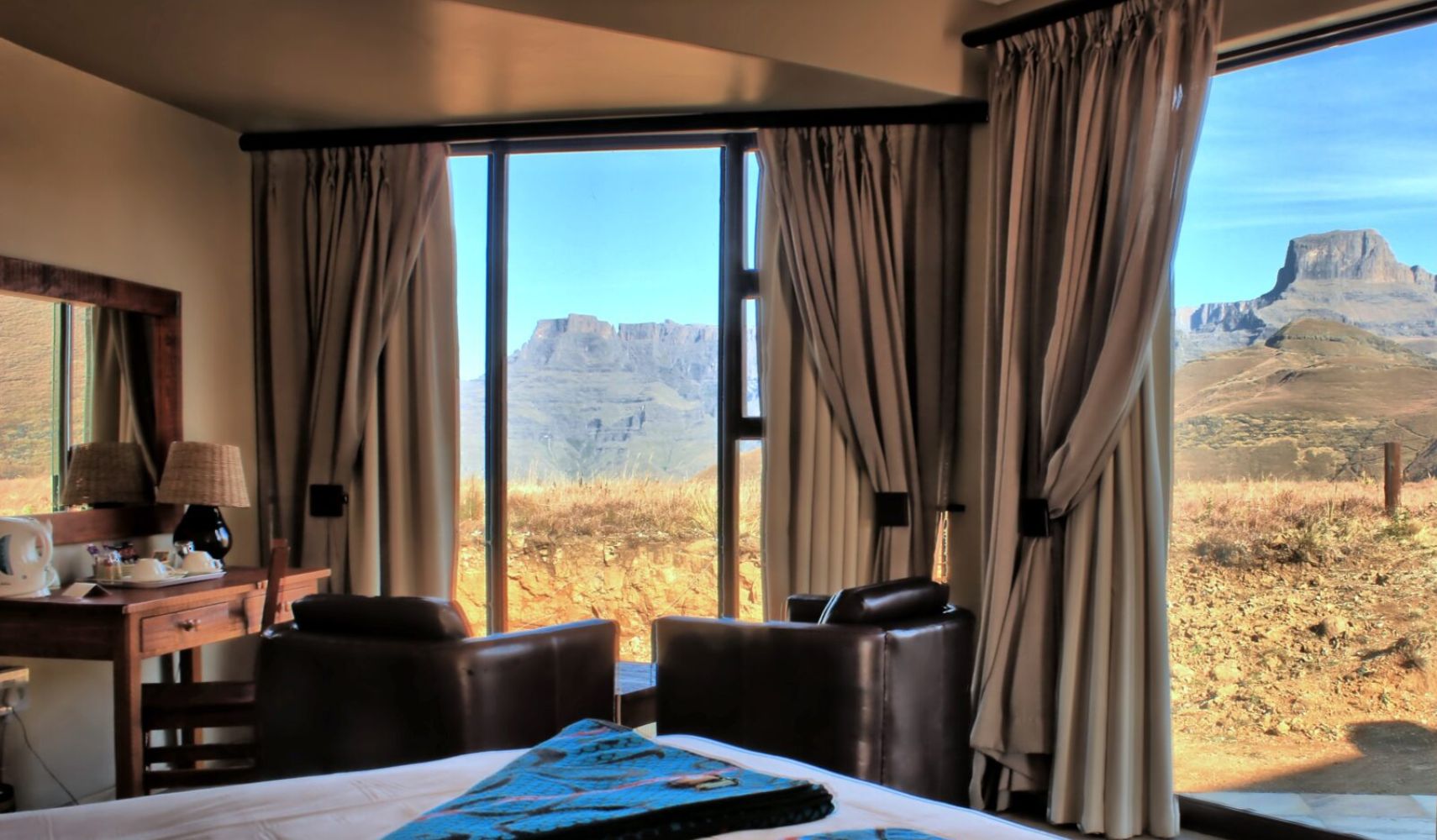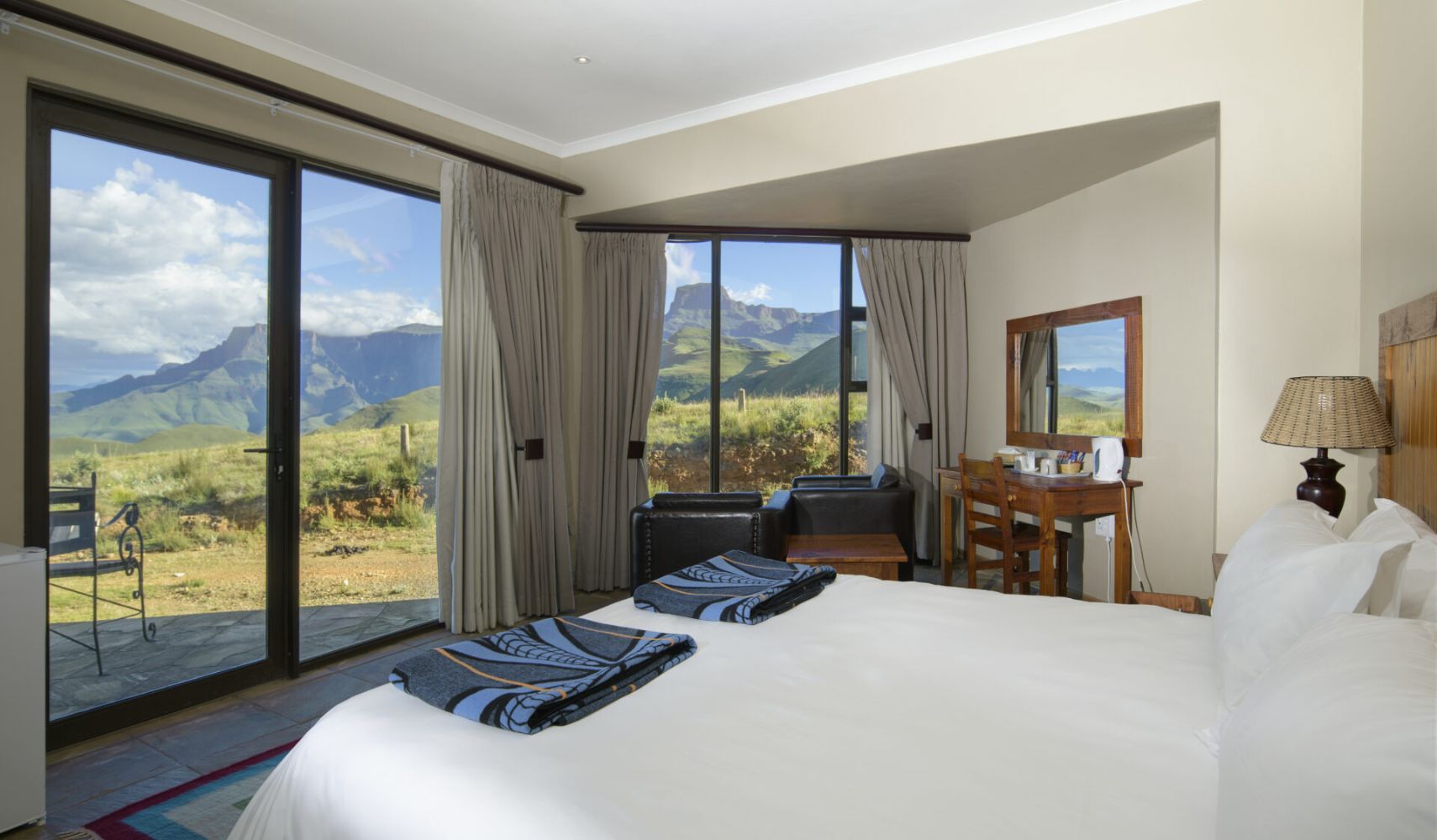 Witsieshoek Mountain Lodge ligt hoog in de Drakensbergen en is een prachtige plek om te genieten van de indrukwekkende bergen en frisse berglucht. De lodge heeft een restaurant, een bar en een gezellige lounge met een open haard waar je na een dag in de natuur heerlijk kunt ontspannen. Vanuit de lodge heb je een fantastisch uitzicht op de Sentinel Peak en de omliggende vallei. De kamers en chalets zijn eenvoudig maar comfortabel ingericht, en vormen een fijne uitvalsbasis voor wandelingen en avonturen, zoals de beroemde hike naar de Tugela Falls.