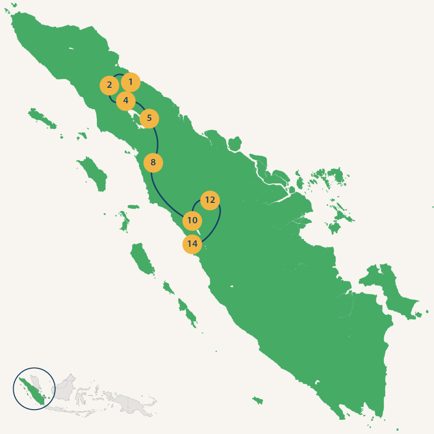 Deze afwisselende reis brengt jullie dwars door Sumatra. Van de orang-oetans in het oosten, via de Sibayak vulkaan en het mooie Tobameer naar het centrale deel, waar jullie olifanten mogen leiden en op jeepsafari gaan. Door naar het westen van de Minangkabau, waar jullie prachtig kunnen wandelen en fietsen. Een afsluiting op een afgelegen strand maakt jullie reis compleet.