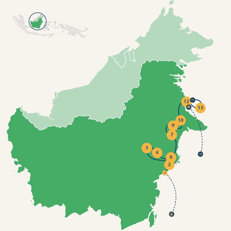 Deze rondreis door het ongerepte Indonesische deel van Borneo brengt je ver van de gebaande paden! Jullie bezoeken de Samboja lodge waar orang-oetans worden opgevangen, maken een boottrip van drie dagen over de Mahakam rivier, logeren in de jungle van Kutai en sluiten af met de unieke onderwaterwereld rond Maratua.