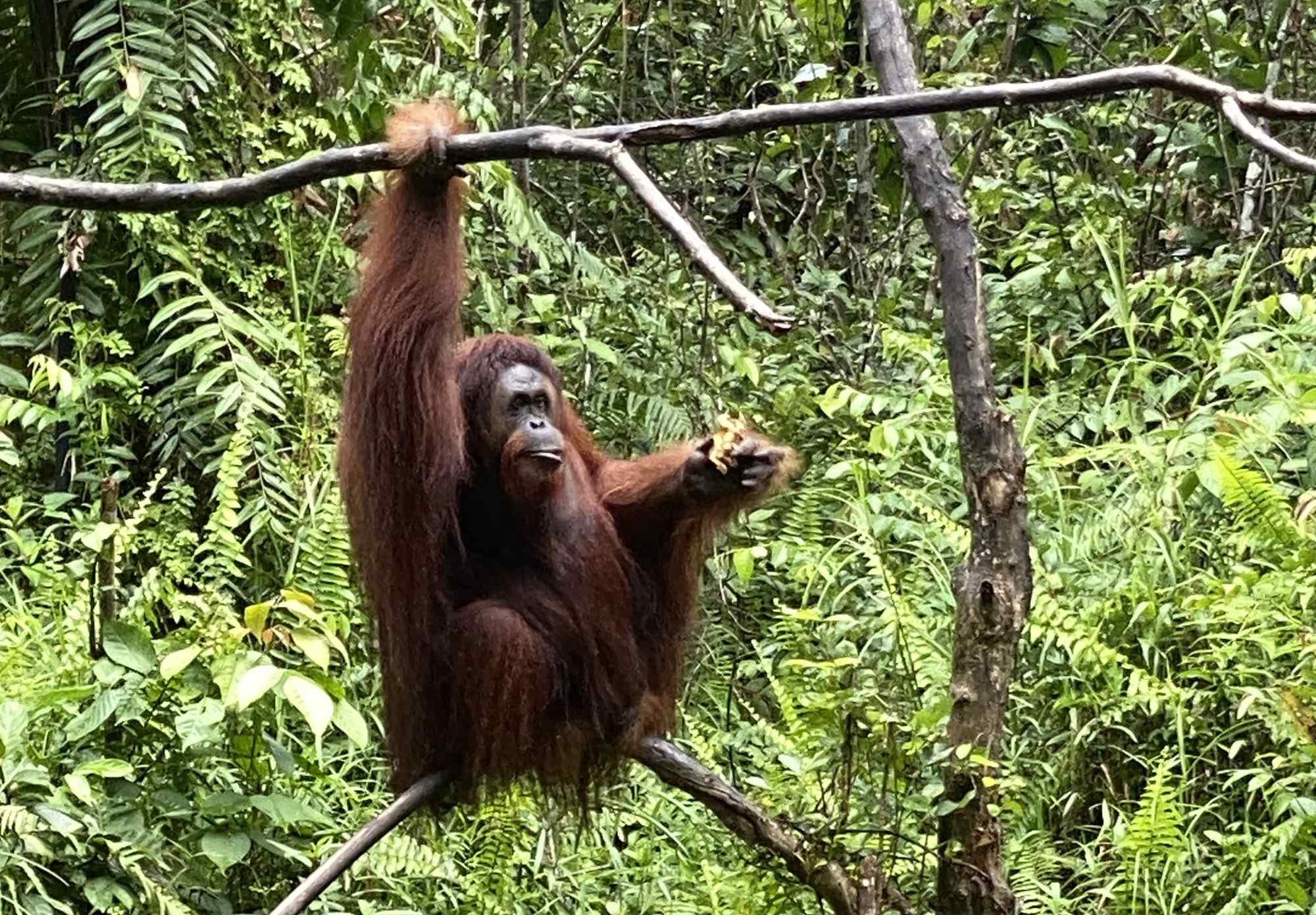 In de ochtend is er vast nog tijd om nog even bij de orang-oetans te kijken. Ze worden gevoederd vanuit een boot en de gidsen kennen het gedrag van de verschillende apen: de een steelt graag de show, de ander eet liever in alle rust. De wijze waarop een orang-oetan een kokosnoot openmaakt, is al een schouwspel op zich.