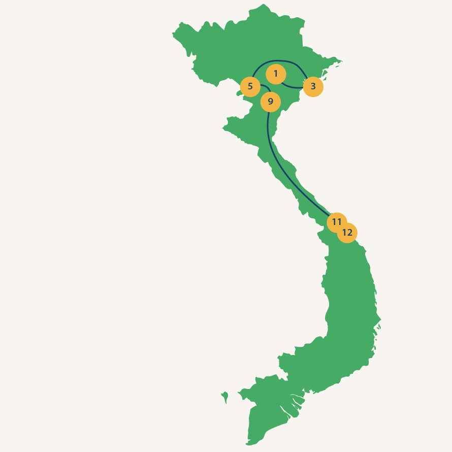 cruise in Bai Tu Long baai – de groene rijstvelden bij Mai Chau en Pu Luong – rotsen, grotten en rivieren bij Tam Coc – per nachttrein naar Da Nang – het strand van Hoi An