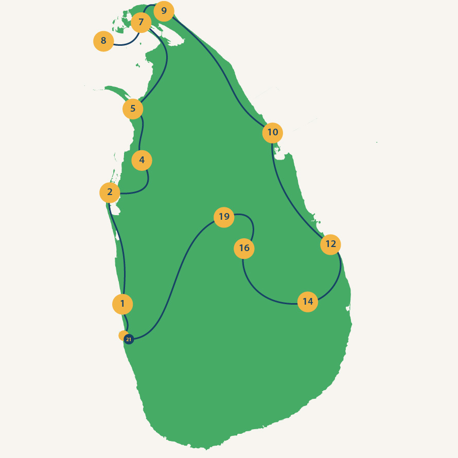 Tijd voor strand, palmen, zon en zee. Jullie reizen naar Nilaveli, net iets noordelijker dan het bekende Trincomalee. Met witte zandstranden en wuivende palmen ben je echt in een tropisch paradijs. Onderweg stoppen jullie nog bij fort Frederick en de bekende Thirukoneswaram tempel. Van maart tot september heb je hier een zeer goede kans op het spotten van walvissen.