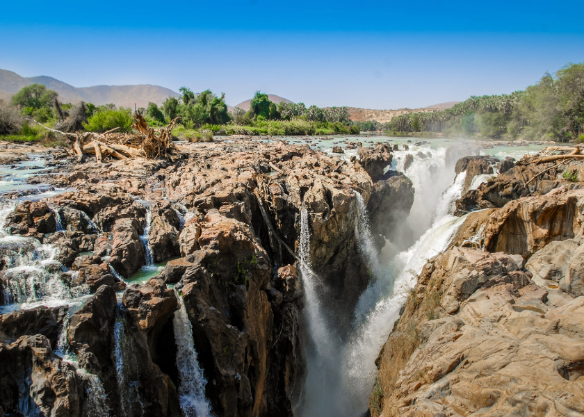 Hier in het uiterste noorden van Namibië, bij de grens met Angola, vind je de indrukwekkende Epupa Falls, een reeks watervallen die door het rotsachtige landschap van deze grensregio stromen. Epupa betekent in de lokale taal ‘vallend water’, hier snap je waarom. De rit naar Epupa biedt al prachtige uitzichten op het veranderende landschap. Eenmaal aangekomen kun je genieten van de rust en de unieke sfeer van deze plek. Jullie verblijven twee nachten in een bijzondere tented room in een sfeervolle lodge.