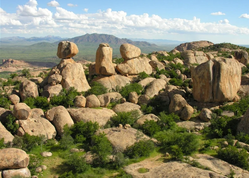 De reis vervolgt zich naar de Erongo Mountains, een fascinerend gebied waar een vulkanische granietmassief oprijst uit de lager gelegen omliggende vlaktes. De bergen zijn overblijfselen van een vulkanisch complex van ongeveer 130 miljoen jaar oud! Dit gebied staat -naast de enorme massieve granieten rotsblokken- bekend om de rotstekeningen van de San die in de eeuwenoude rotsen zijn gemaakt en ons een kijkje geven in hun oude tradities.